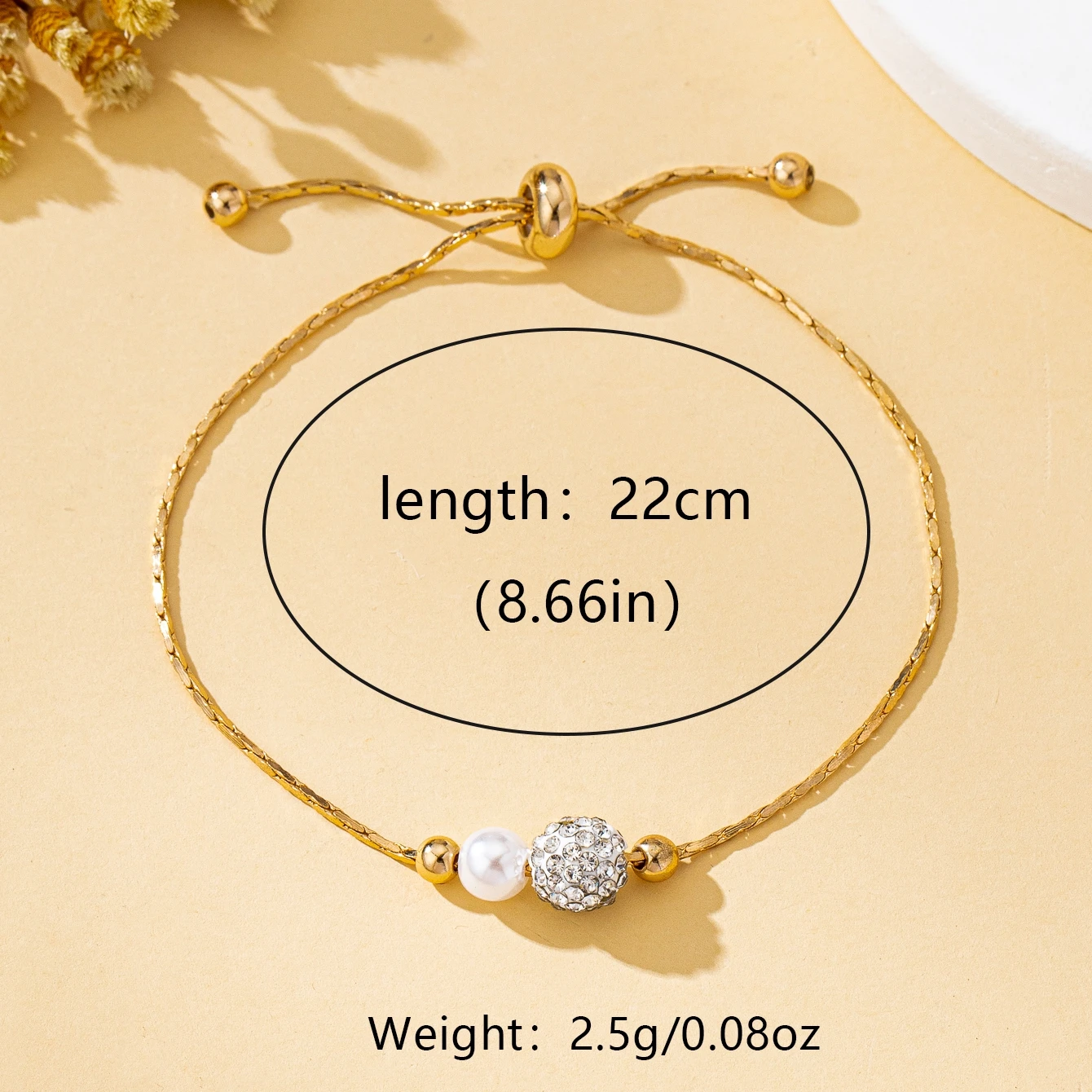 Lunessia apyrankė – plona, elegantiška auksinės spalvos grandinėlė su dviem akcentais: subtiliu perlo imitacijos karoliuku ir žvilgančiu faktūriniu rutuliuku. Minimalistinis dizainas atrodo moderniai ir lengvai, todėl apyrankė puikiai tinka tiek kasdienai, tiek atostogoms ar vasaros vakarams.